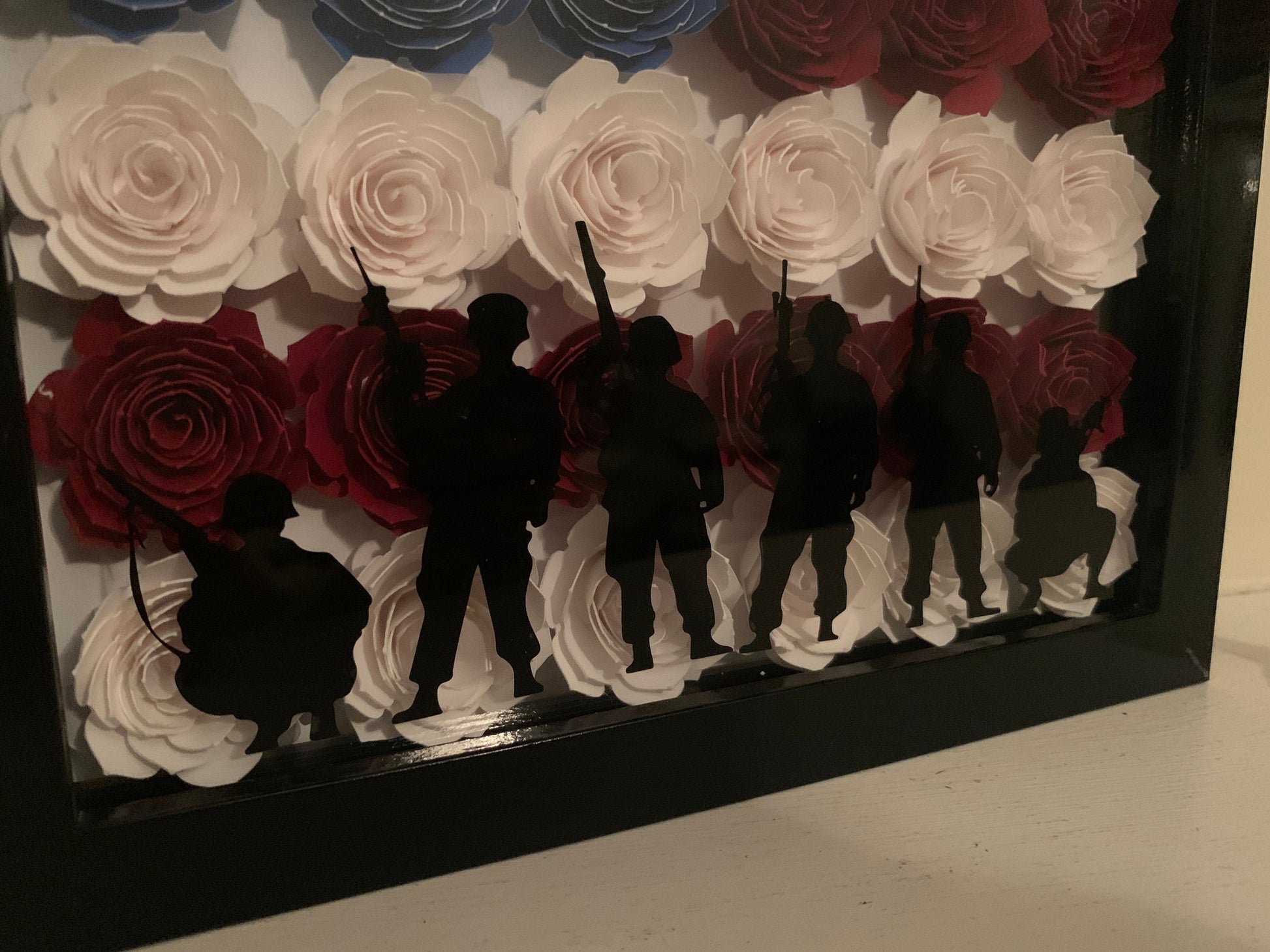 “Soldiers honoring the Flag” shadow box. This frame includes beautiful rolled flowers and pearls thoughtfully laid out to create a miniature American flag. What a beautiful way to commentate a Loved One who had served our country! 💞