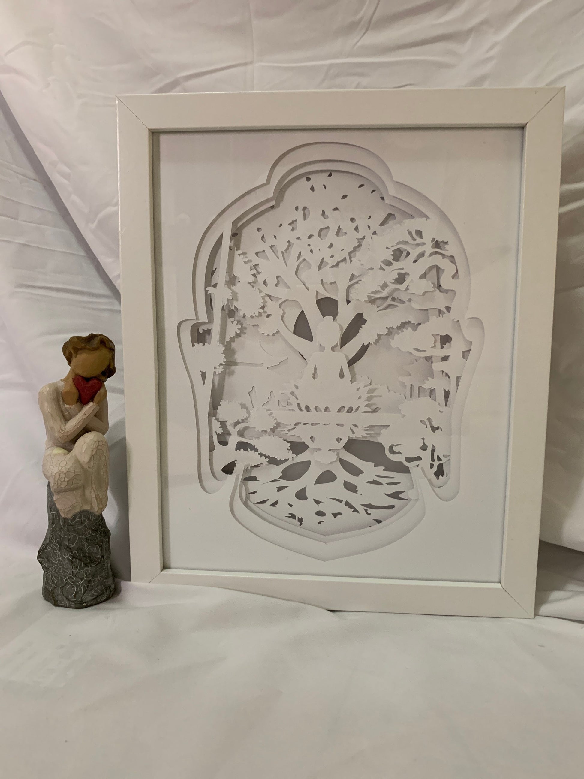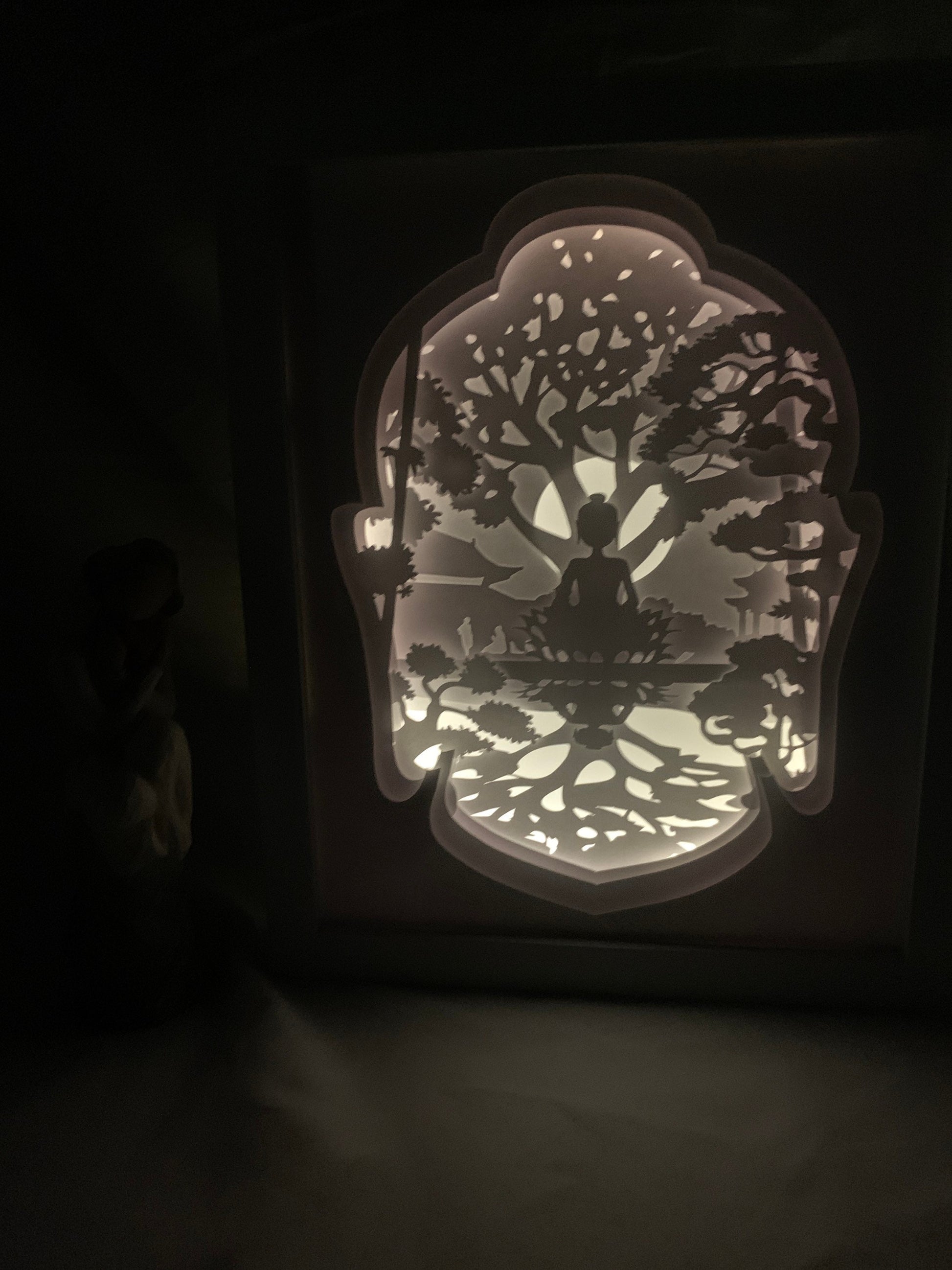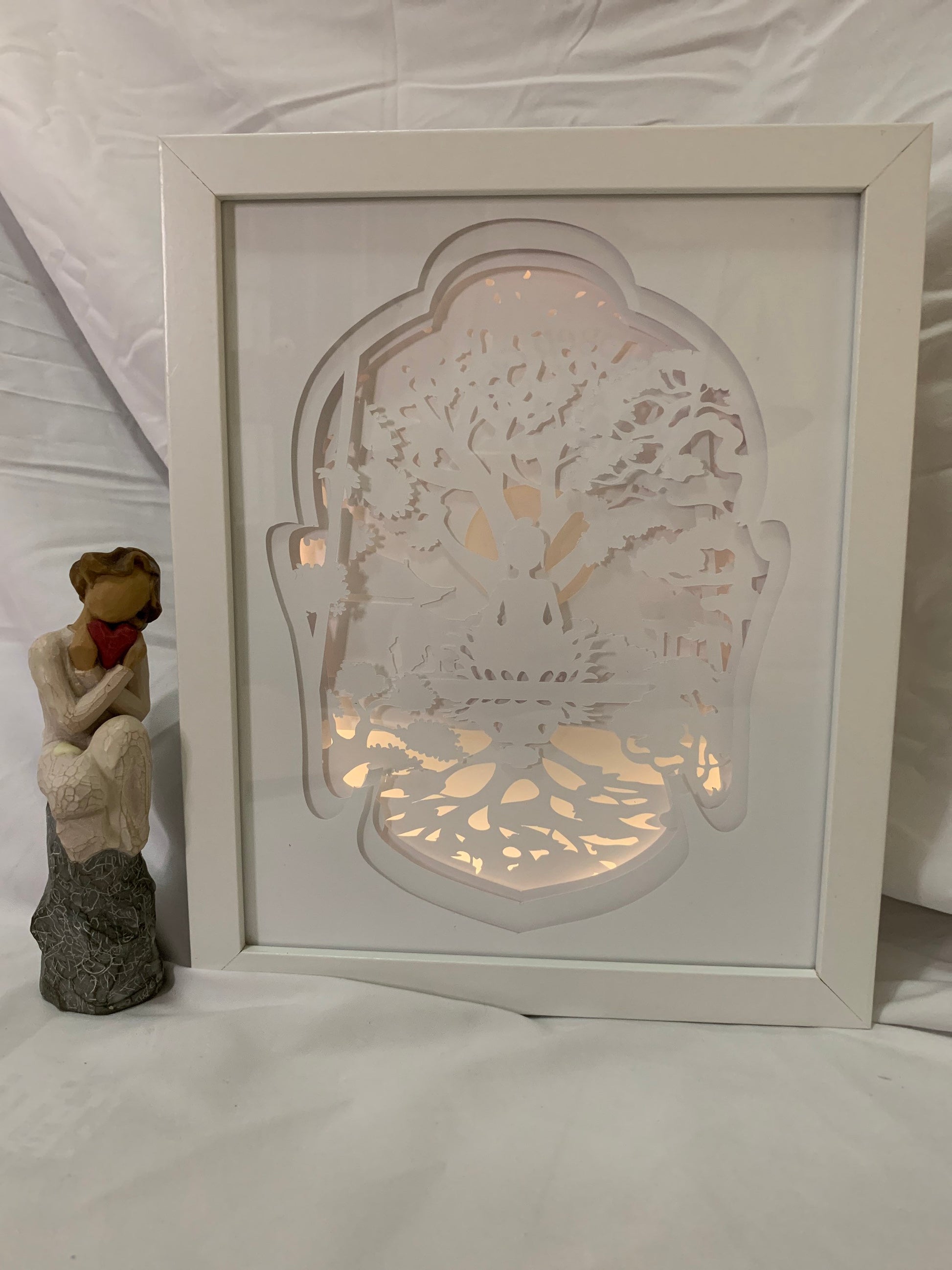 “Buddha” lighted shadow box. So much beauty in this piece, the piece comes alive when the lights are turned on! 😁