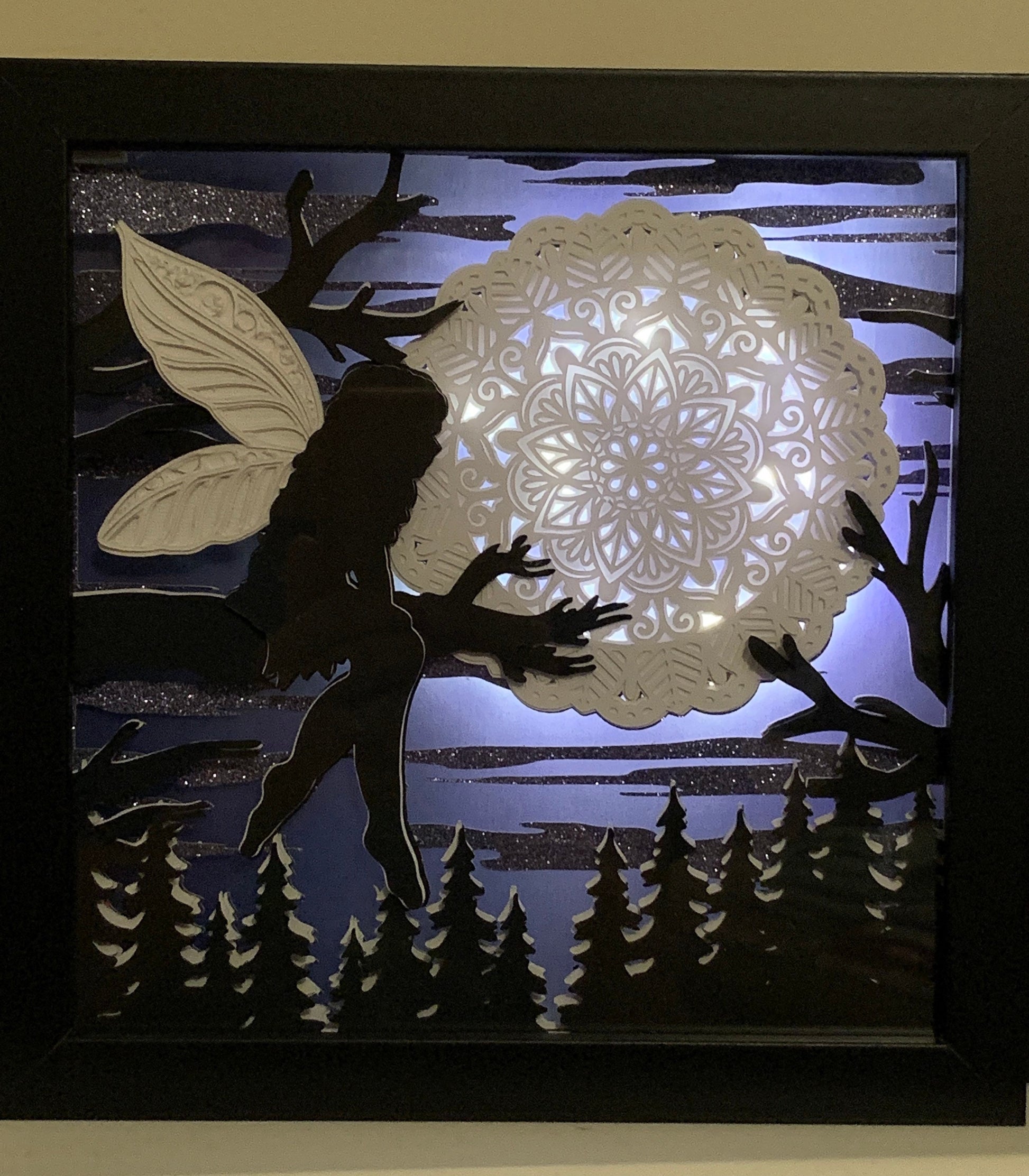 “Fairy on a tree branch looking at the Mooon” lighted shadow box.