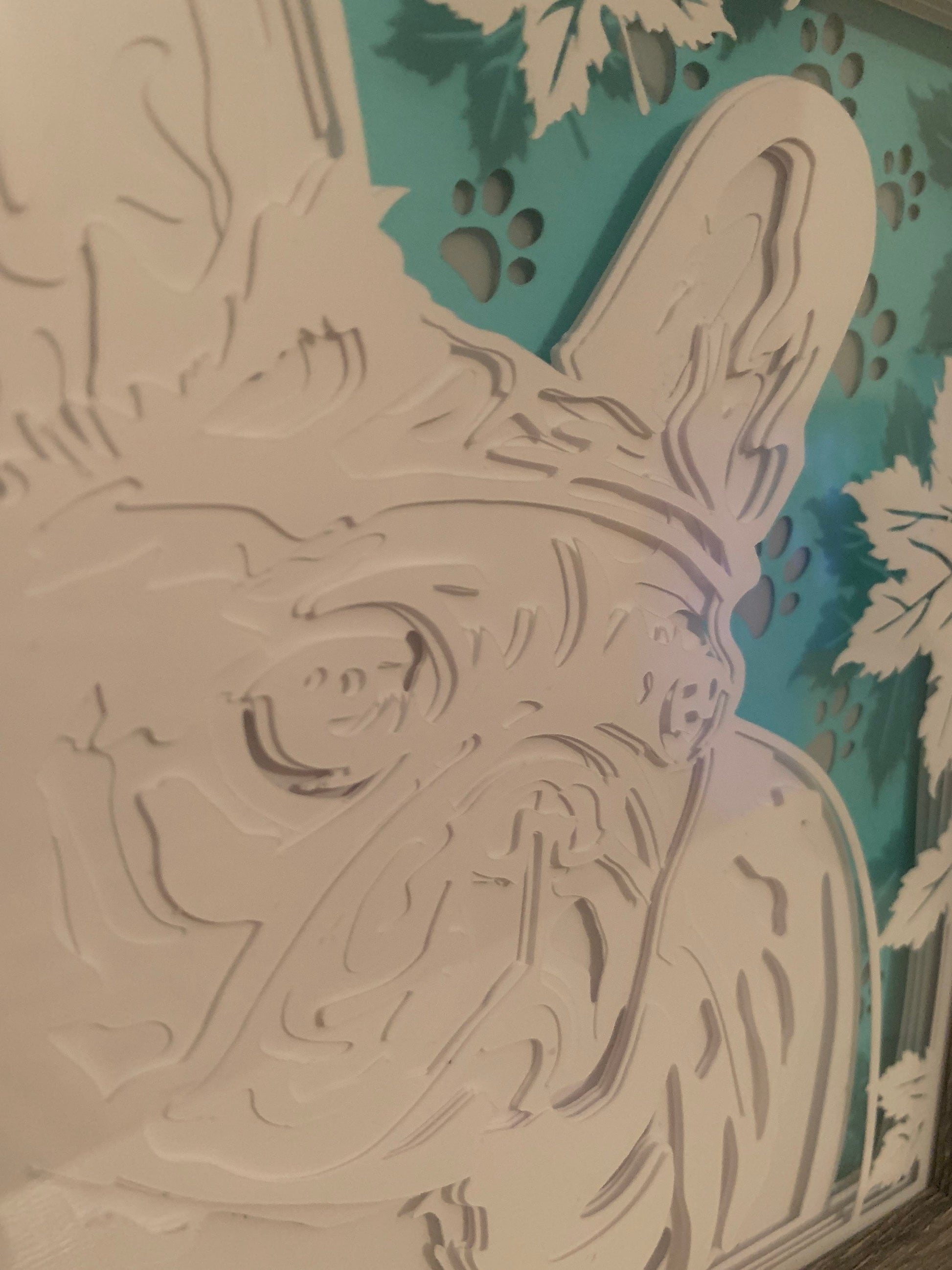 โFrenchieโ lighted shadow box. So much beauty in this piece, the piece comes alive when the lights are turned on! ๐ I love the way it looks with the wooden frame!