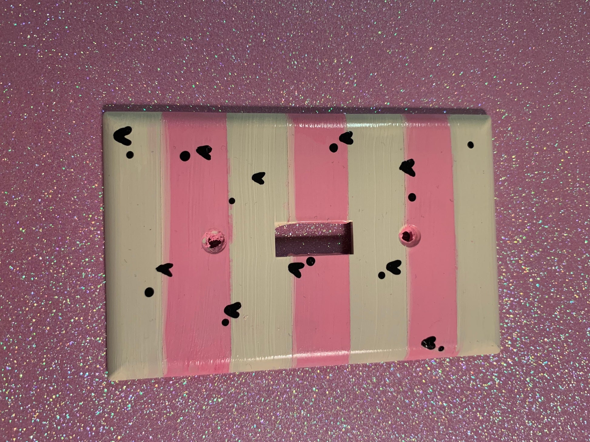 Standard size single light switch cover. This beautiful cover is decorated with a pink and white stripes and accented by small black hearts. So beautifully designed! ☺️