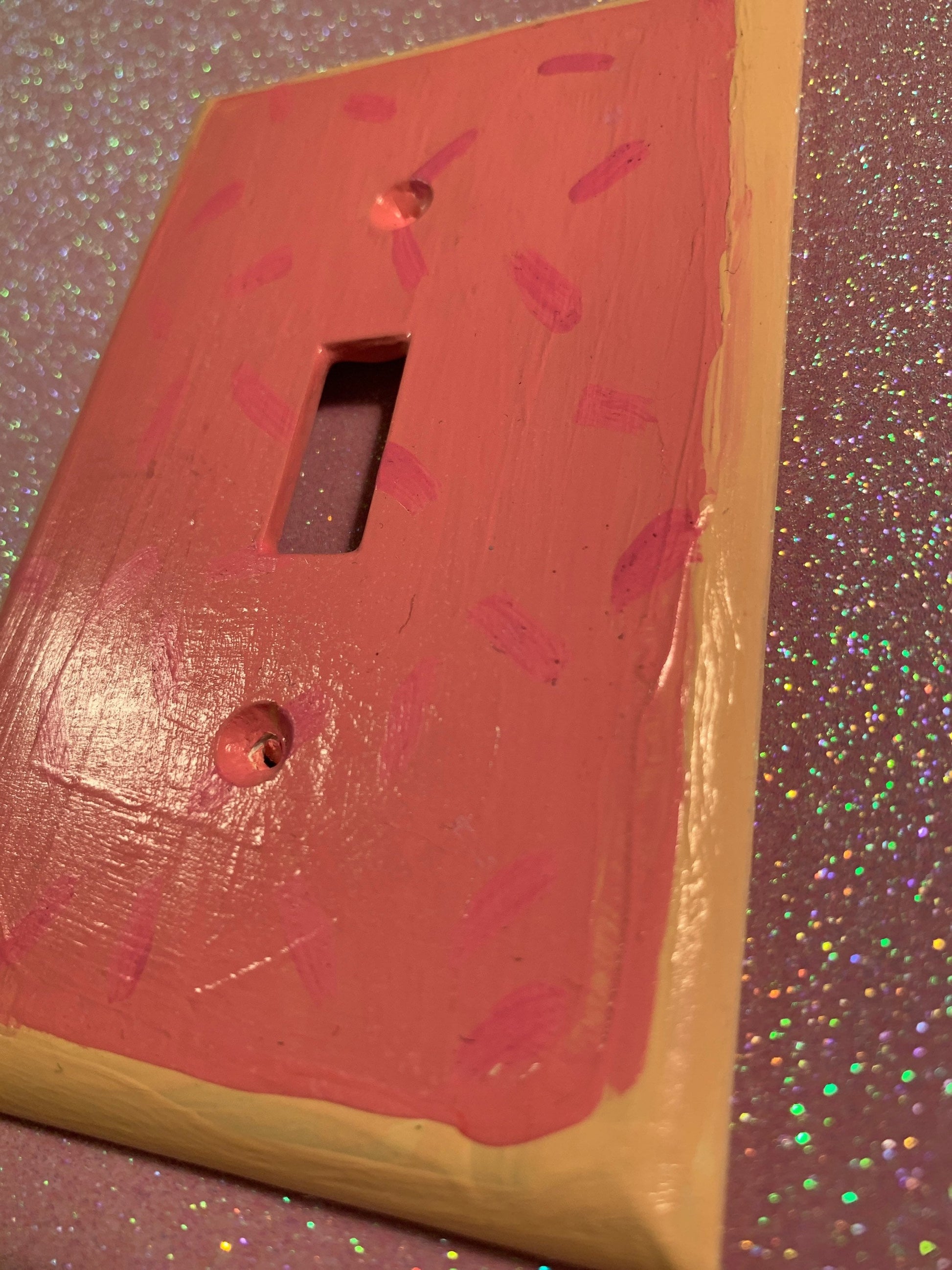 Standard size single light switch cover. This beautiful cover is decorated to look like a Strawberry POPTART. So beautifully designed, please don’t try to eat it! ☺️
