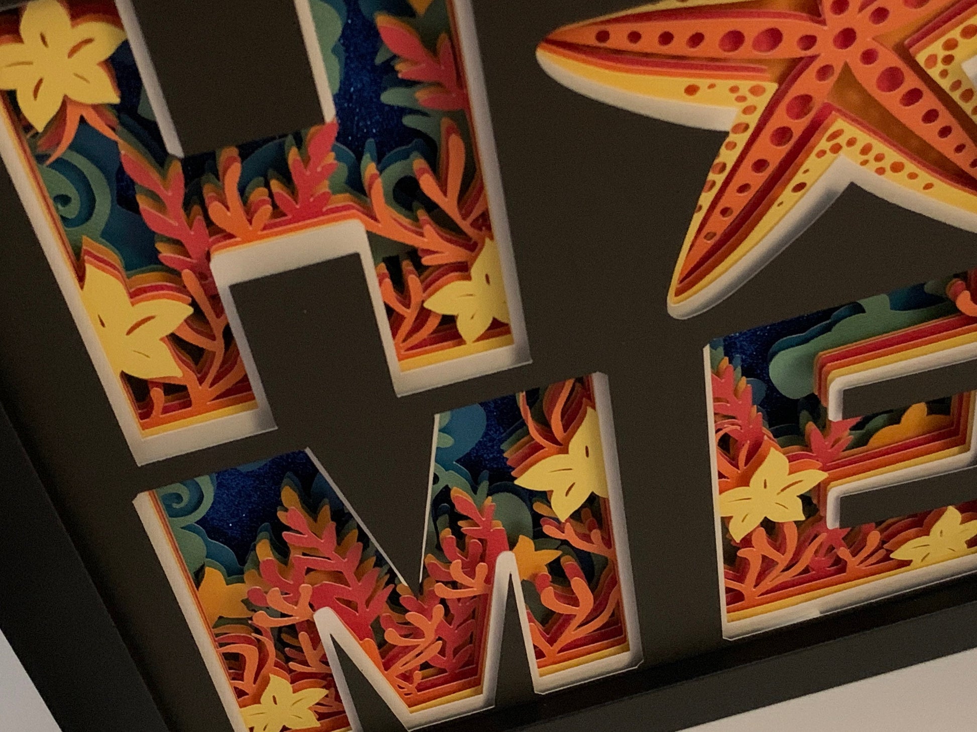 “Layered HOME with Starfish” Shadow box. Gorgeous frame with a starfish to make the 0. The pictures do not do this piece justice!