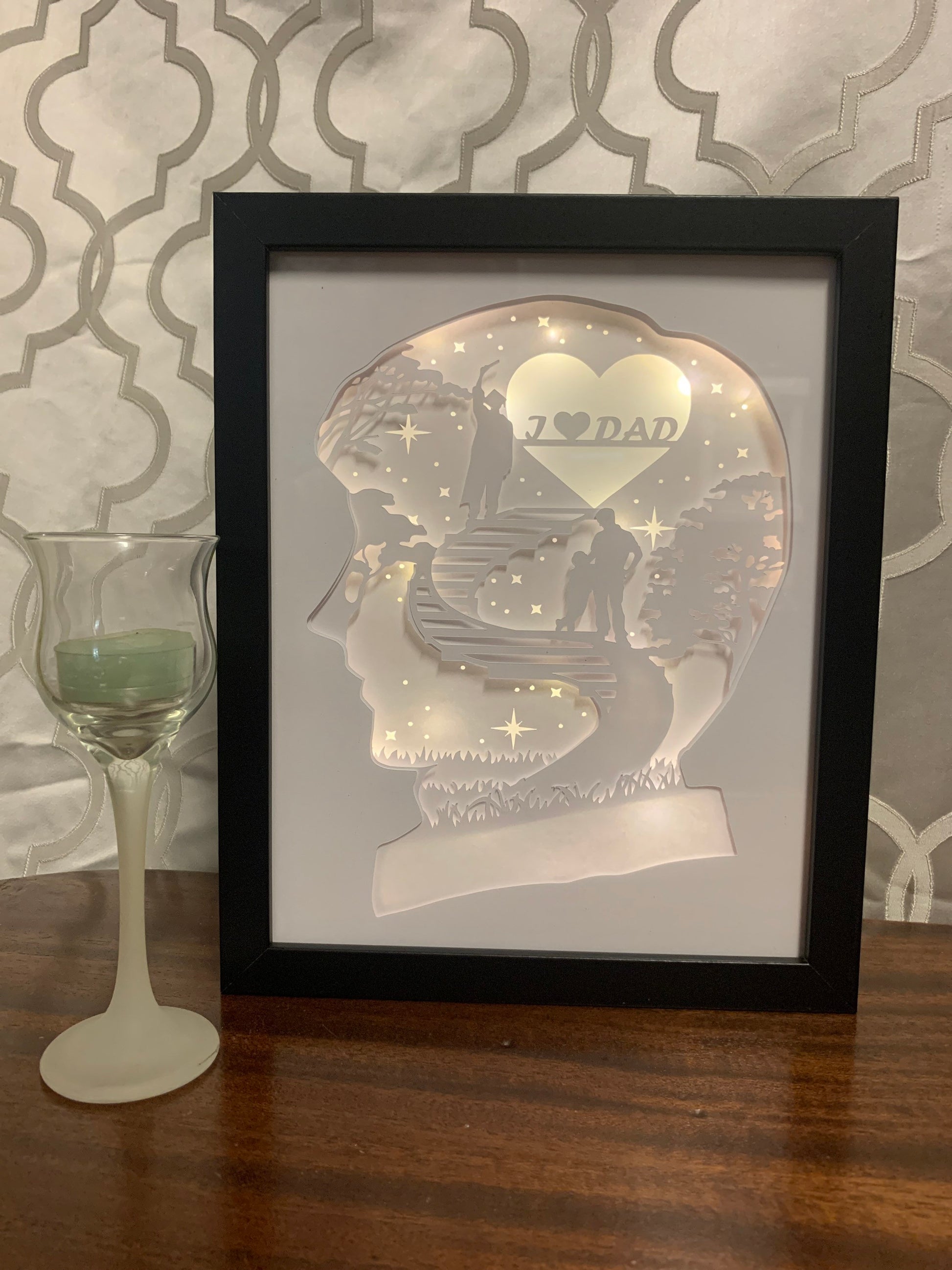 “I ❤️ Dad” Lighted shadow box. Pictures are of the lights in the room on low and then the room dark. This is a gorgeous and unique piece.