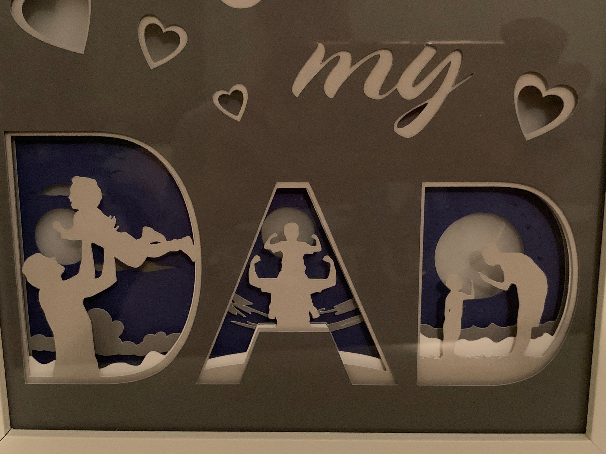 “I Love my Dad” Lighted shadow box. Pictures are of the lights in the room on low and then the room dark. This is a gorgeous and unique piece.