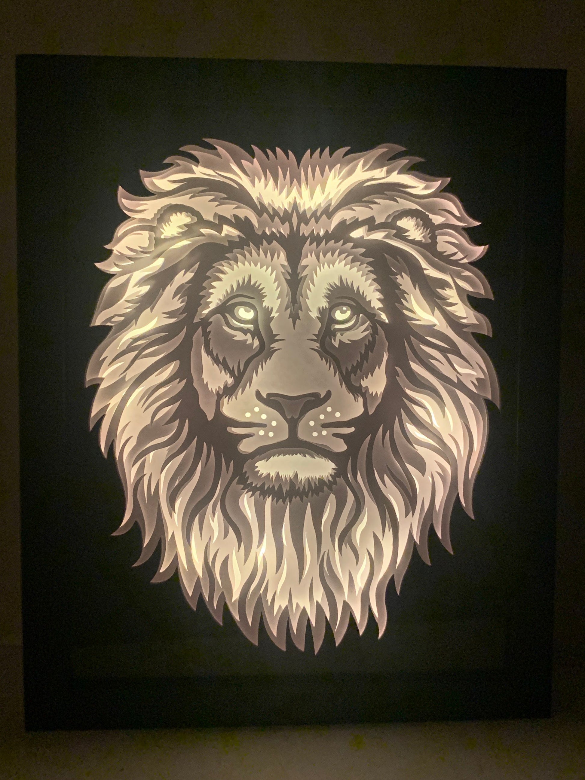 βLeo the Lion faceβ lighted shadow box. So much beauty in this piece, the piece comes alive when the lights are turned on! π