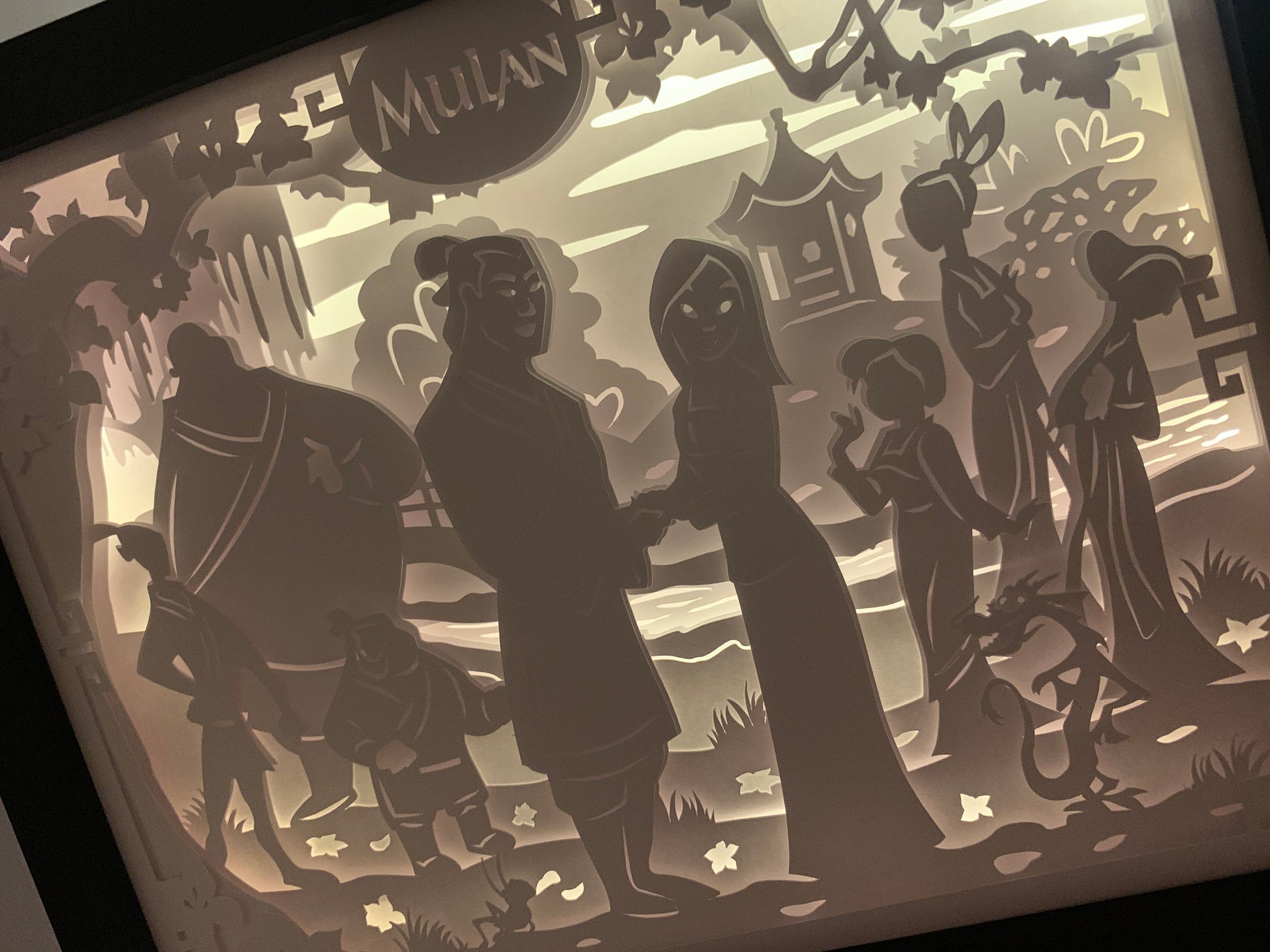 “Mulan” Shadow box. Pictures are of the lights in the room on low and then the room dark. This is a gorgeous and unique piece. They make great night lights for a kids room.