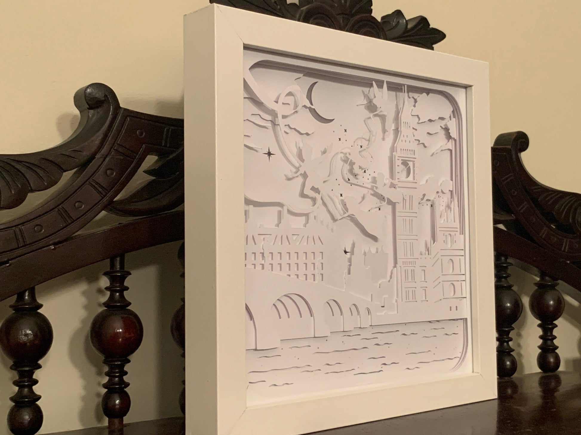 βPeter Pan, Tinkerbell and the kids first flight to Neverland β lighted shadow box. One of the best parts of the movies is commemorated in this piece. π§ββοΈ