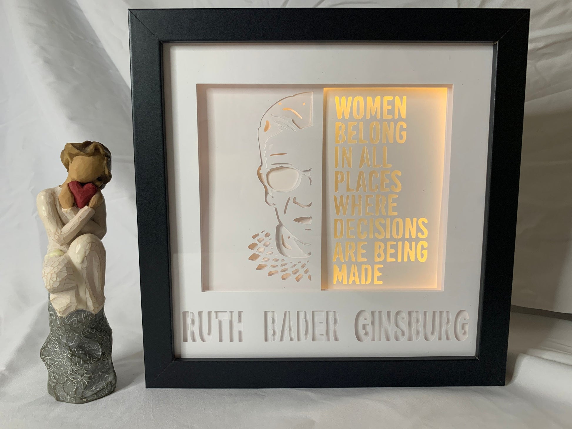 “Woman belong in all places decisions are being made. RBG; Ruth Bader Ginsburg” lighted shadow box. What an incredible woman. The pictures show the frame with different lighting, low lights and no lights. 😊
